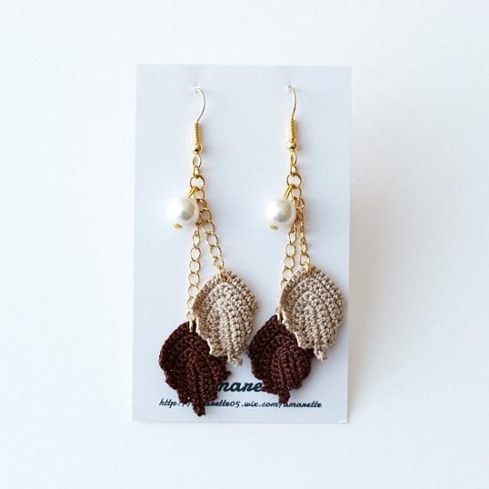 Leaves made of knitted lace yarn and cotton pearl placed above both hanging from the ear will sway.