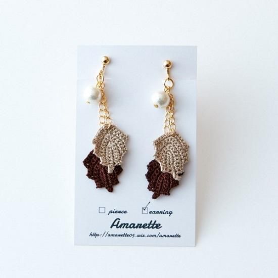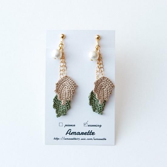 アーティスト"Amarette"のレース糸で編んだ葉とコットンパールのイヤリングです。