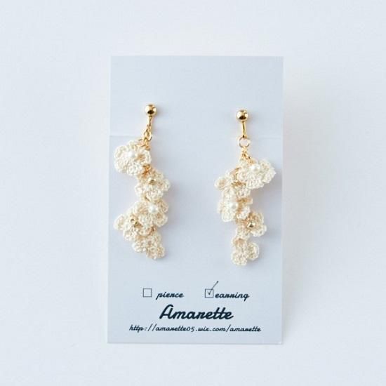アーティスト"Amarette"のレース糸で編んだお花たちを集めたイヤリングです。