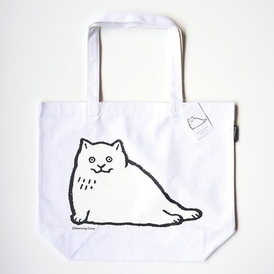 with the original drawings of "White Cat" printed using a silkscreen method on a relatively big canvas bag.